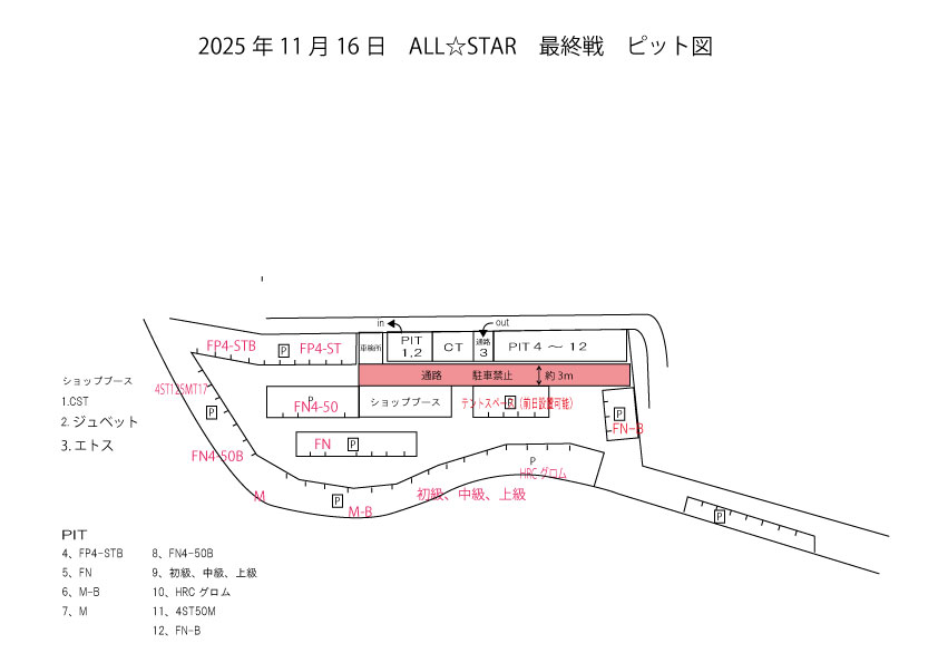 2025年度 11月16日 最終戦 エントリーリスト/タイムスケジュール/ピット割図 Eコースお知らせ2025年度 11月16日 最終戦エントリーリスト PDF版はこちら。タイムスケジュール PDF版はこちら。ピット割図 PDF版はこちら。